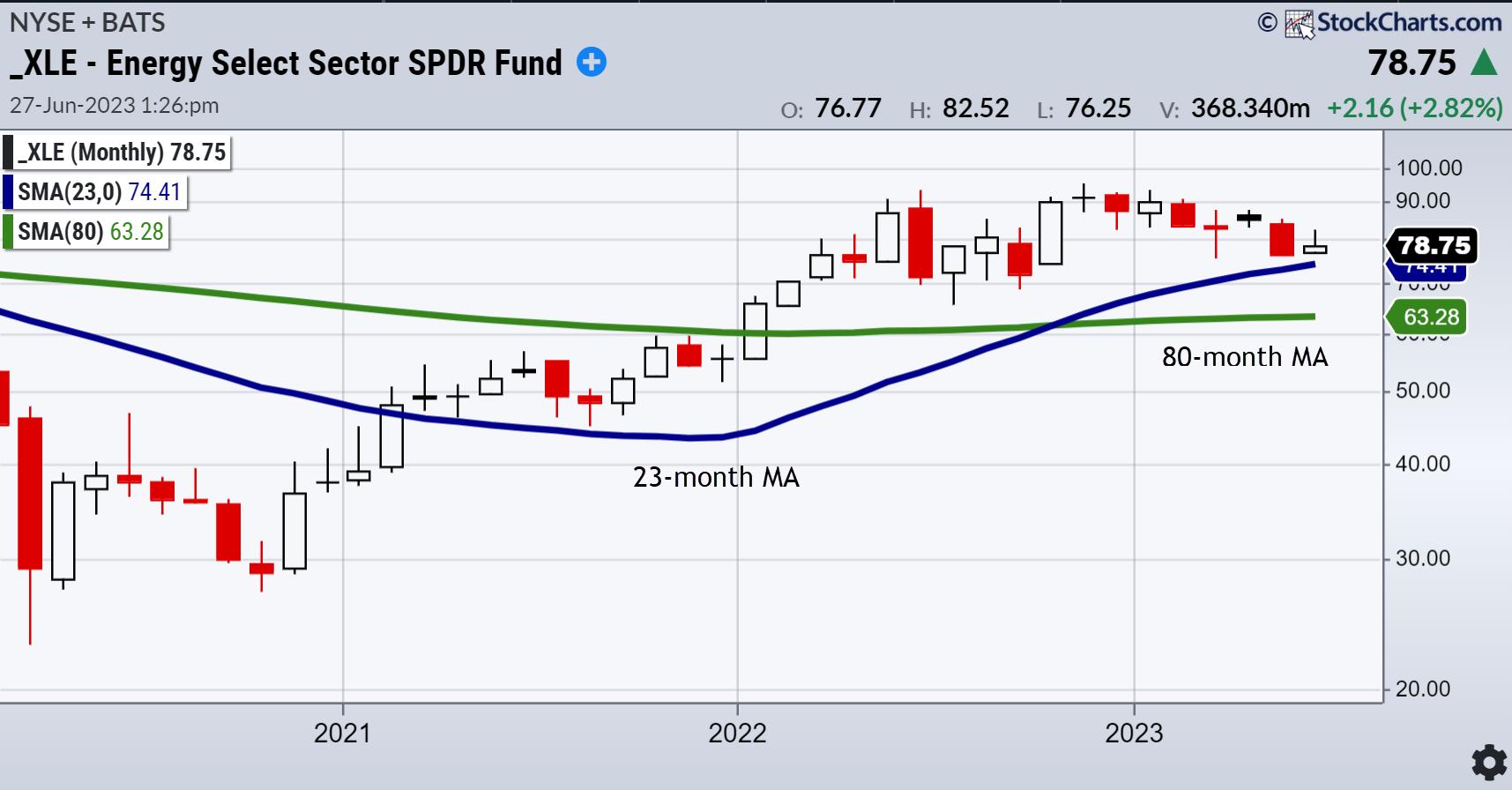 The energy ETF XLE is a good example of an area of commodities that went into expansion in 2021 and has since consolidated. In this consolidation and correction, XLE holds the 23-month MA.
