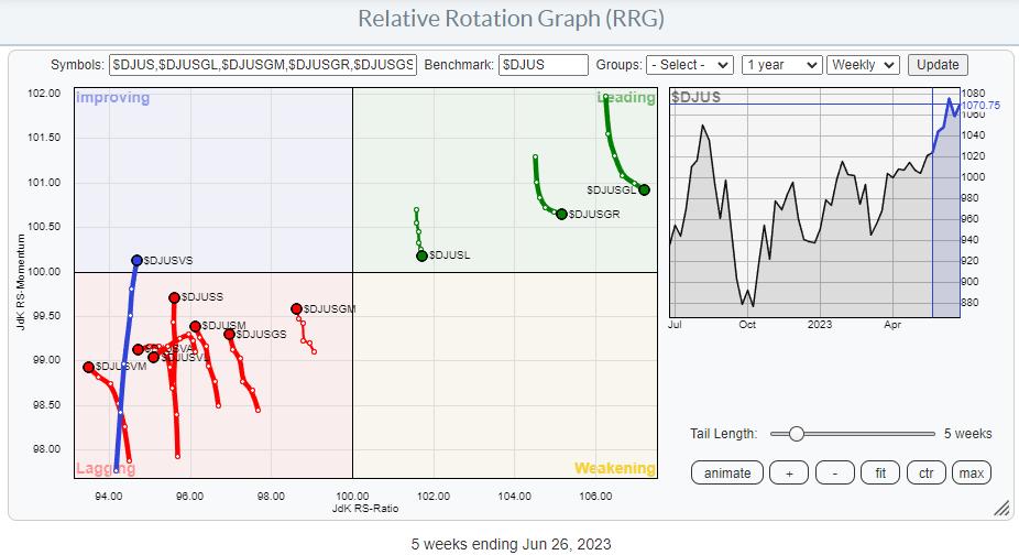 The combination of these weekly and monthly tails suggests that there is more upside potential left for growth stocks in terms of relative strength and that the recent loss of momentum on the weekly RRG should be seen as temporary.