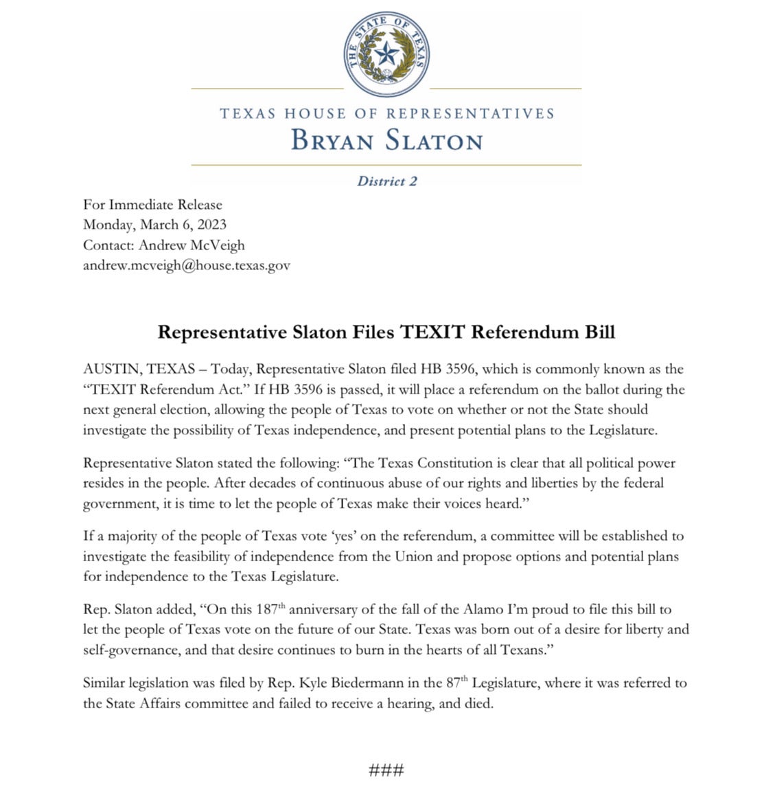 Republican Texas State Representative Bryan Slaton introduced a bill Monday to allow Texans to vote on whether the Lone Star State should secede from the United States.