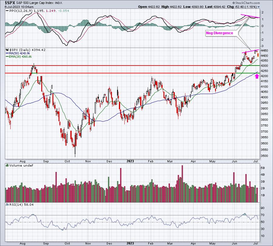 During any uptrend, I look to the 20-day EMA as my initial key short-term support. I typically view the odds of a successful test as quite strong – unless there’s a negative divergence. In this case, there is one. So we need to consider that the odds have shifted a bit more toward a 50-day SMA test (pink arrow).