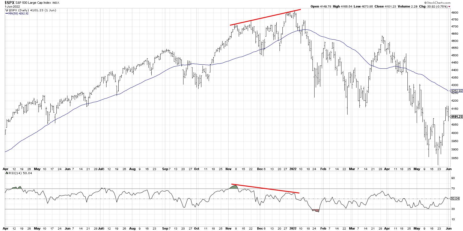 Here’s a classic example, where the S&P 500 moved higher through the end of 2021 while the RSI sloped lower. A classic bearish divergence occurred, implying that the bull phase of 2021 was nearing its endpoint.