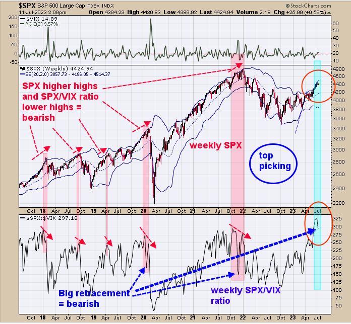 The bottom window is the weekly SPX/VIX ratio and the next higher window is the weekly SPX. We pointed out the times when the SPX weekly has a minor retracement and the SPX/VIX ratio has a large retracement. This doesn’t happen all the time, but when it does, it is a good warning that market may be near a high. The SPY was up five days in a row going into Monday (July 3), which predicts the market will be higher within five days 85% of the time. If the market does make a higher high this week or next week and the SPX/VIX ratio makes a lower high, a divergence will show up. We noted the previous divergences in shaded light pink on the chart above, and all came near highs in the SPX. Evidence is growing that a high in the SPX may not be far off.