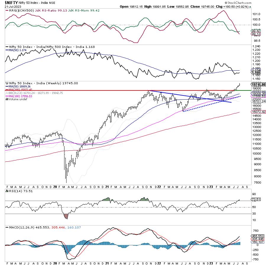 It is exactly a month when the NIFTY staged a major breakout by crossing above the previous high point of 18887; this time, it was the fourth week in a row when the markets extended their gains. This has also led to the markets closing at their fresh record lifetime highs as well. While some signs of mild consolidation appear on the shorter timeframe charts, the NIFTY stays in a firm uptrend post the breakout on the weekly charts. The trading range expanded; the NIFTY oscillated in a 428-point range over the past five days. The headline index finally closed with a net gain of 180.50 points (+0.92%) on a weekly basis.
