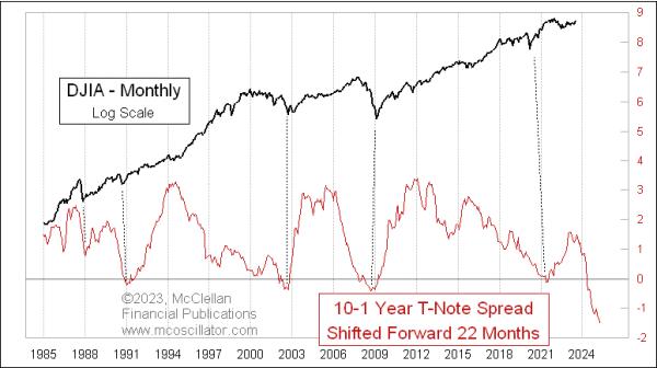 A year ago, I noted that the inverted yield curve was saying that a bottom for stock prices could be expected in 2024. But the important caveat to that expectation was that it depended upon the yield curve finishing its inversion then. What has happened instead is a furthering of that inversion, which will add fuel to the coming bear market and which postpones its end date.