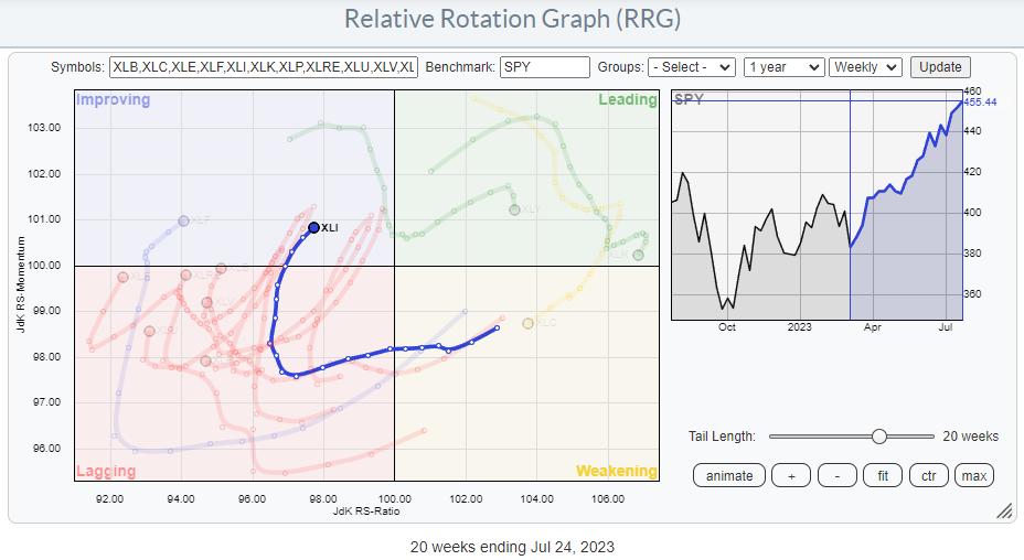 On the Relative Rotation Graph for sectors above I have highlighted the trail of the Industrials sector over the last 20 weeks. The trajectory coming out of the lagging quadrant into improving and now turning into an RRG Heading between 0-90 degrees suggests that further improvement is ahead of us.