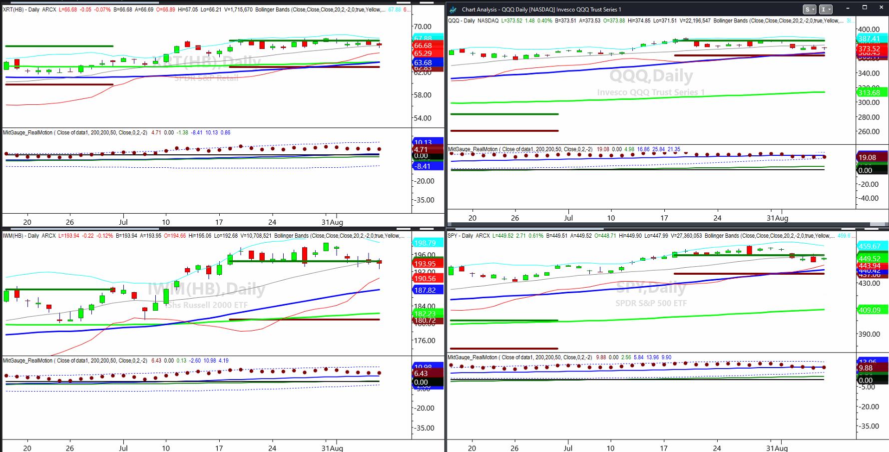 The Russell 2000 and Retail Sector seem like the apparent places to watch for next moves. The Russell 2000 (IWM) literally dances on the July 6-month calendar range highs. 194.35 (closing basis) is key to hold, and, if it does, with stronger momentum than SPY or QQQ, the rotation into small caps and value could be the thing for the next 6 months.