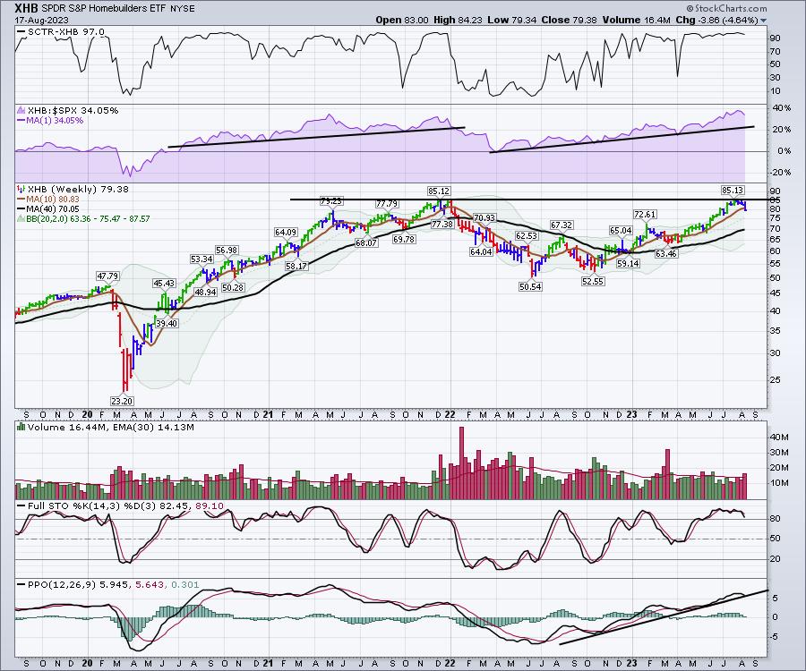 XHB was recently at a prior high, and the ITB made newer highs. Amazingly, XHB — the homebuilders ETF — got within 0.01 cent of the prior high, then pulled back below the 10-week moving average on Thursday. Everything is still in an uptrend! The only real sign of weakness is the potential for a sell signal on the PPO.