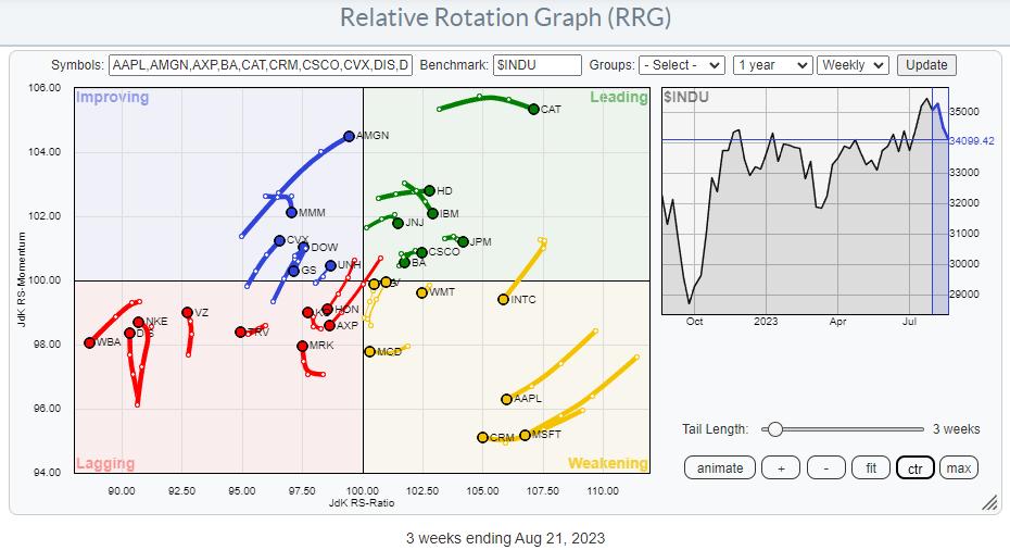 The Relative Rotation Graph that shows the rotations inside the DJ Industrials index exhibits an evenly spread out universe of stocks. This is primarily the result of $INDU being a price-weighted index, as opposed to the S&P500, which is cap-weighted. The difference in weight between the largest and the smallest stock in the universe is, therefore, much smaller, which makes the RRG more evenly spread out.