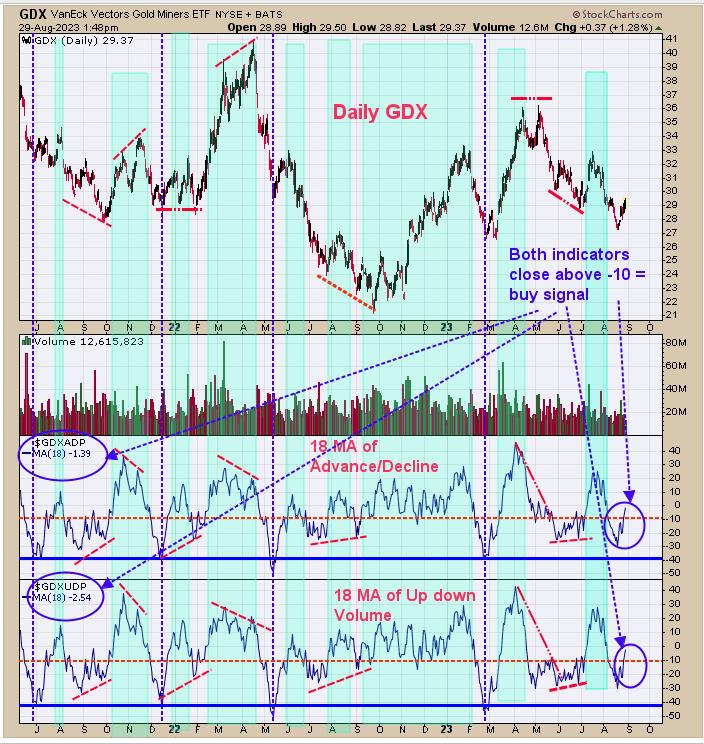Yesterday, we said, “the light blue-shaded areas are when the 18-day averages for up down volume percent and advance/decline percent for GDX are above -10. When both indicators are above -10, GDX is in an uptrend. Currently, the 18-day average for the up down volume stands at -11.33 (almost there) and the 18-day average Advance/Decline percent stands at -9.33 (bullish). For buy signals, both indicators need to be above -10 and stay above -10 for the buy signal to continue. Unless something weird happens, it looks as though a rally phase in GDX is about to begin.” Today, the up down volume indicator trades at -2.54 (bottom window) and the advance/decline indictor trades -1.39; both above -10 and bullish. As long as both indicators hold above -10, the uptrend in GDX should continue.
