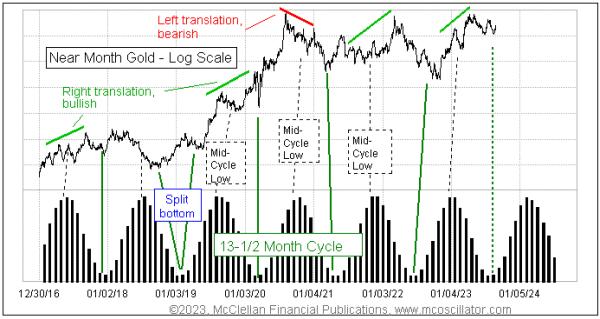 This 13.5-month cycle was due for its major cycle low in July to August 2023. I always speak of its due dates in extremely approximate terms, because gold’s actual bottoms can arrive a month or two early or late versus the ideal, while still be considered as arriving normally. And more than once in history, the cycle bottom has seen gold prices split their bottom into two separate ones, each equidistant before and after the ideal cycle low date. In other words, the existence of the 13.5-month cycle is not a great timing tool for identifying the moment of the bottom in gold prices.