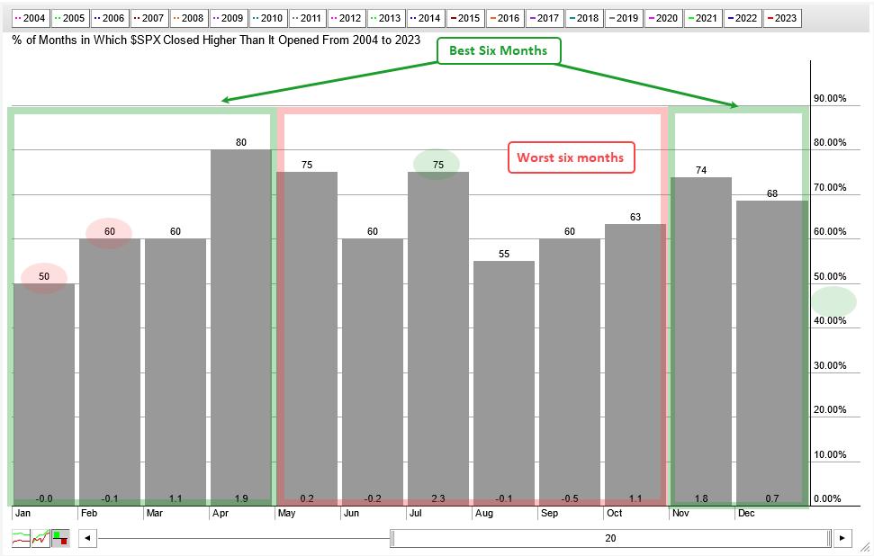 The chart below shows historic seasonal performance for the S&P 500 since 2004 (20 years). The red shading shows the worst six months, and the green shading highlights the best six months. There are some pretty good months within the worst six month period (May, July). There are also some so-so months within the best six month period (January, February).