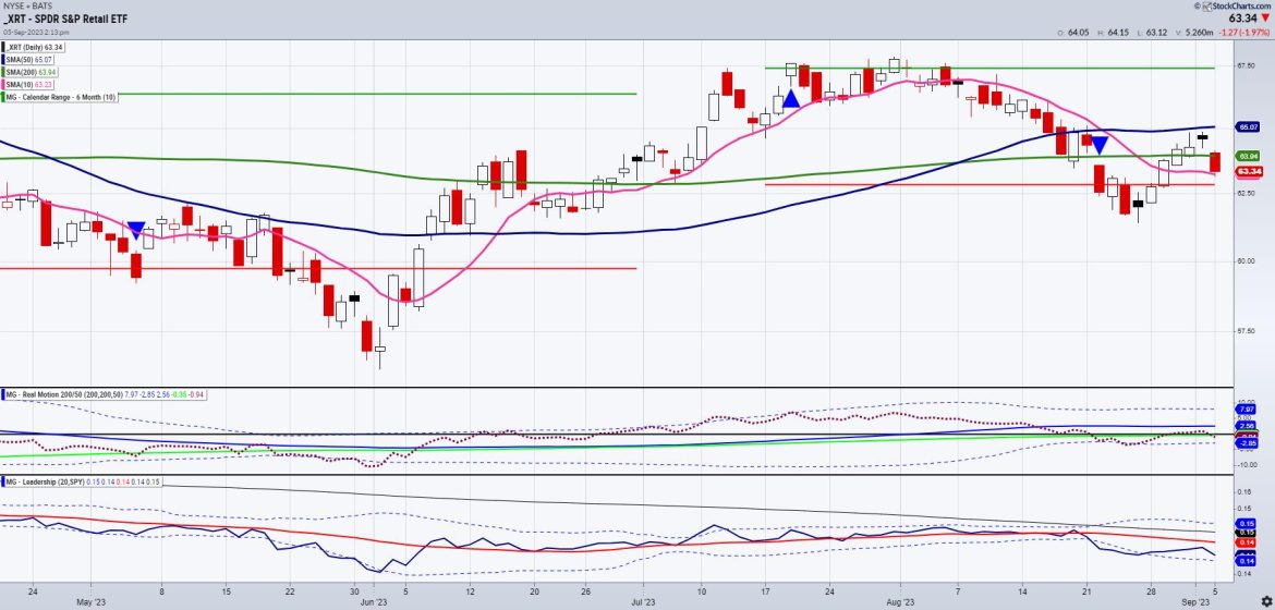 The Phase: With the return under the 200-DMA (green) while the 50 DMA is above (blue), the phase is distribution. Fast MA: With today’s action, XRT is holding the 10-DMA (pink).Calendar Ranges: XRT could not clear above the July 76-month calendar range high (horizontal green line). However, it is holding the July 6-month calendar range low (red line). Real Motion: XRT’s momentum is weakening after the mean reversion buy signal at the end of August. Leadership: XRT has underperformed the SPY since early August and continues to weaken against the benchmark.