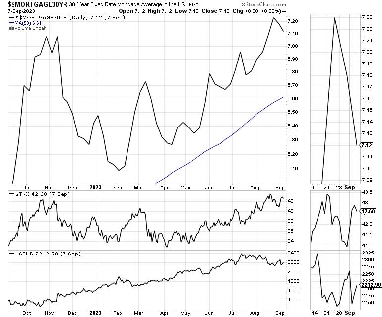 Nowhere is this relationship clearer than in the composite price chart, which relates the U.S. Ten Year Note (TNX) to the 30-year mortgage rate (Mortgage) and the S&P Homebuilders Sector Index (SPHB).