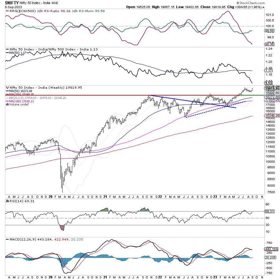In the previous technical note, the importance of the support level of 19250 was discussed; it was mentioned that if this level stands protected for Nifty, the Index can rebound and inch higher towards 19700+ levels. While trading along these lines, the markets enjoyed trending sessions throughout the week. It had a technical surge and widened its trading range as well. Against the range of 234.90 points seen in the week before this one, NIFTY moved in a larger 434.30 points range and also managed to close near its high point of the range. While continuing to trend all through the past five sessions, the headline index NIFTY closed with a net gain of 384.65 points (+1.98%) on a weekly basis. It may be noted that September has seen the index trading higher by 566.15 points as of now.