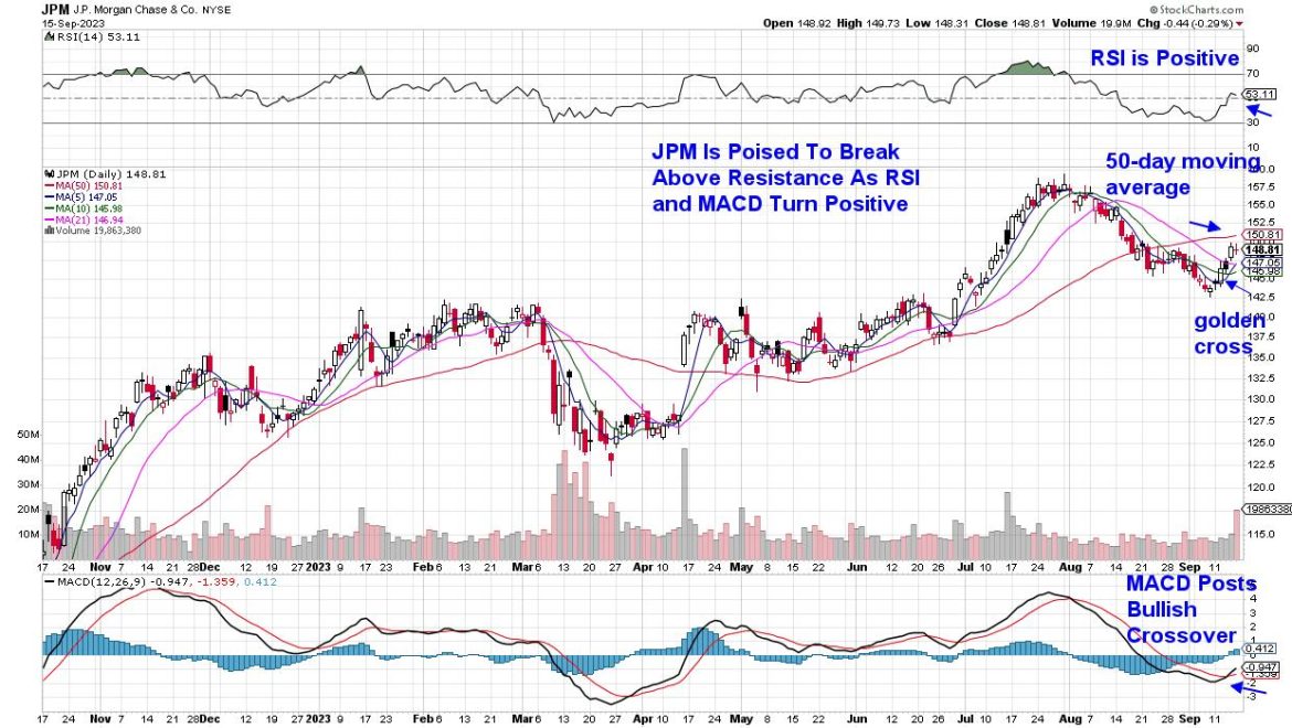 J.P. Morgan (JPM) closed above its 10- and 21-day moving averages last week on relatively high volume, which, in turn, pushed the RSI into positive territory. The MACD has posted a bullish crossover, with the black line crossing above the red. The next big hurdle will be a close above its 50-day moving average, which would confirm a new uptrend.