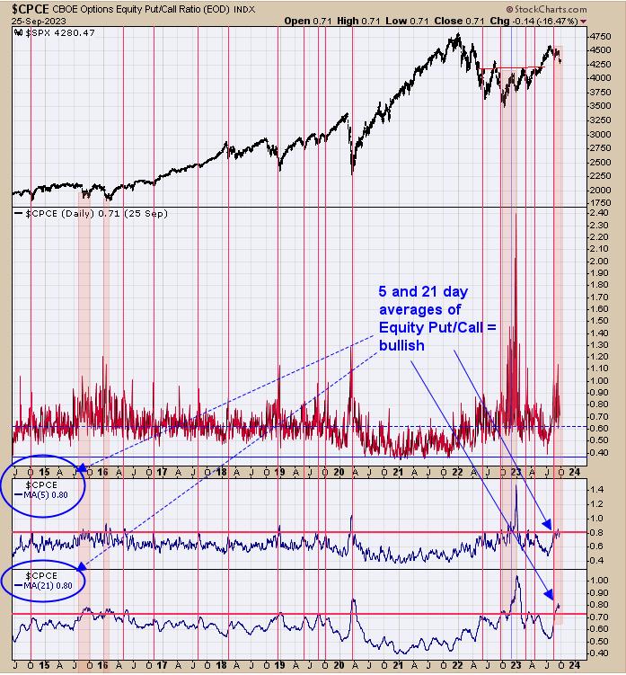 The bottom window is the 21-day average of the CBOE equity put/call ratio, and the next window higher is the 5-day average. We identified the times when both indicators reached bullish levels with red- and pink-shaded areas. As you can see, both are in bullish levels, suggesting a market low is not far off.