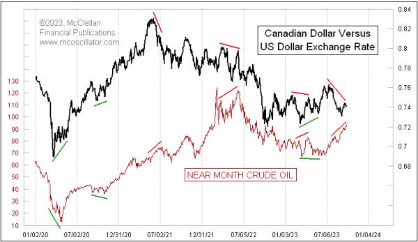 I have highlighted several other such divergences, moments when the two plots disagreed about which way to go. In each of these disagreements, one would have been better off listening to the message of the Canadian dollar than listening to the price direction of crude oil.