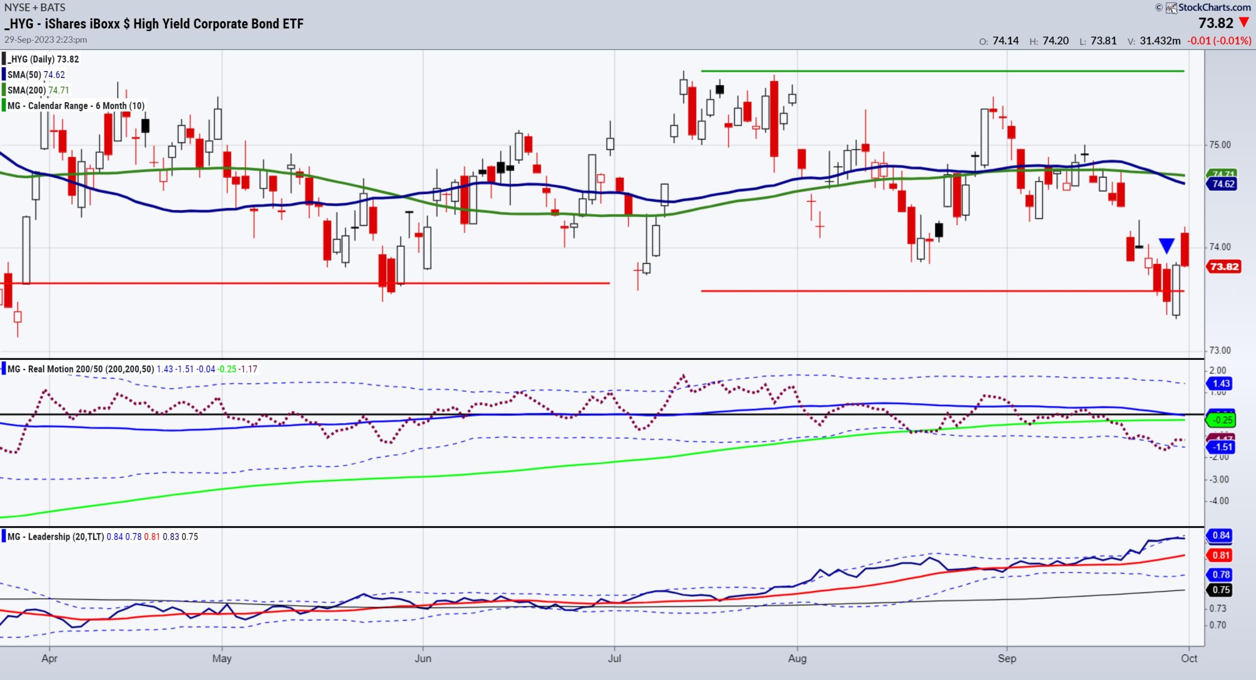 The chart of HYG has several fascinating and a somewhat taming influence on the extreme negativity. For starters, HYG held its ground on Friday as the indices turned red. (So did XRT, by the way.) Secondly, HYG returned over the July 6-month calendar range low (red horizontal line). Thirdly, HYG held the March lows made after the mini-banking crisis. Fourth, HYG had a mean reversion buy in our Real Motion momentum indicator.