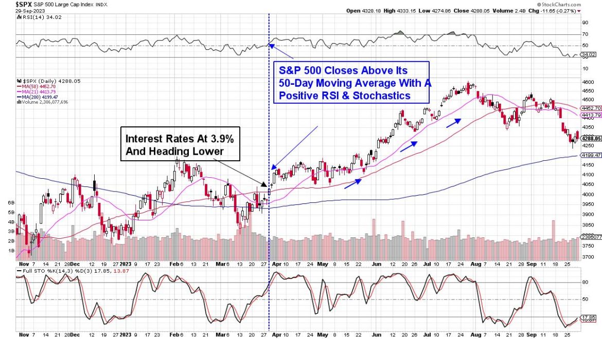 The current downtrend in the markets was signaled by a close below the 50-day moving average on heavy volume earlier this month, which was coupled by a move of the RSI and Stochastics into negative territory. Further weakness followed, with news that the Fed is anticipating an elevated rate scenario for longer than anticipated, pushing stocks even lower.