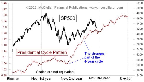 Before we get to the bullish portion starting upward again, the Presidential Cycle Pattern (PCP) in this week’s chart says we still have a bit more sideways chopping to get through. But readers and chart analysts should not assume that the stock market will follow this pattern precisely, especially in October, because of one particular anomaly in the data.