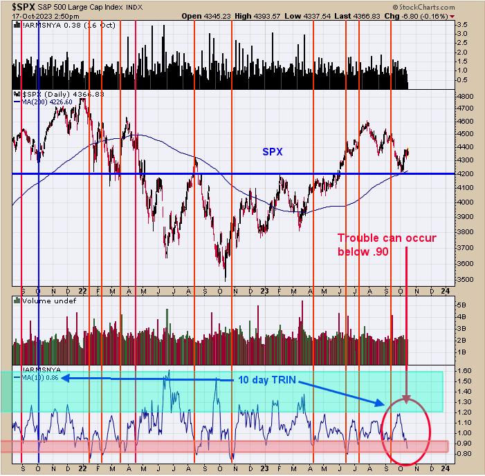 During October option expiration (this week) seasonality leans bullish, and it’s possible that Option Expiration bullish lean may trump the bearish lean 10-day TRIN for a short while. There is a possibility a pullback may be coming but it may come after option expiration week; having said that, we do expect higher prices going into yearend.
