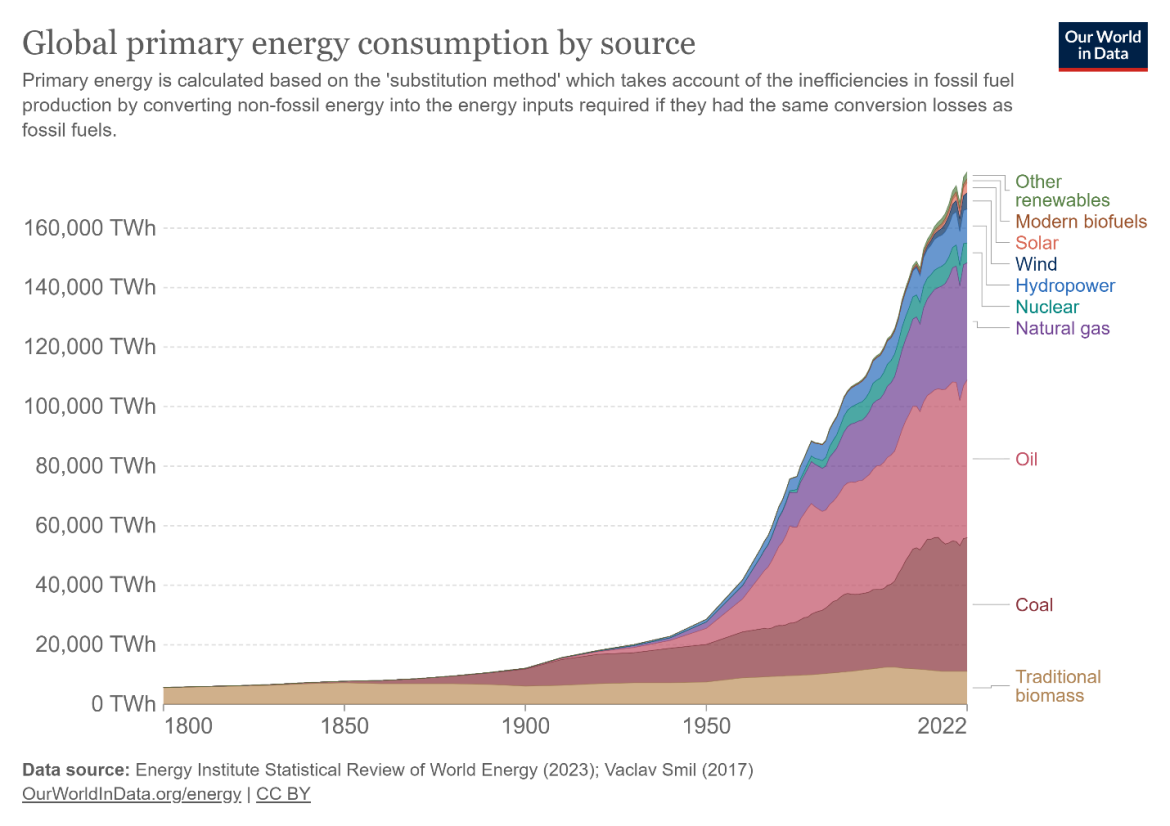 Look at the energy usage in the graph below from Hannah Ritchie at Our World in Data. Every energy transition we’ve had — from wood to coal and from coal to oil and gas—have been additive. As a civilization, we don’t replace prior energy sources; we add to them with better ones. Clarification: Better means cheaper or denser energy sources that therefore packs more punch.