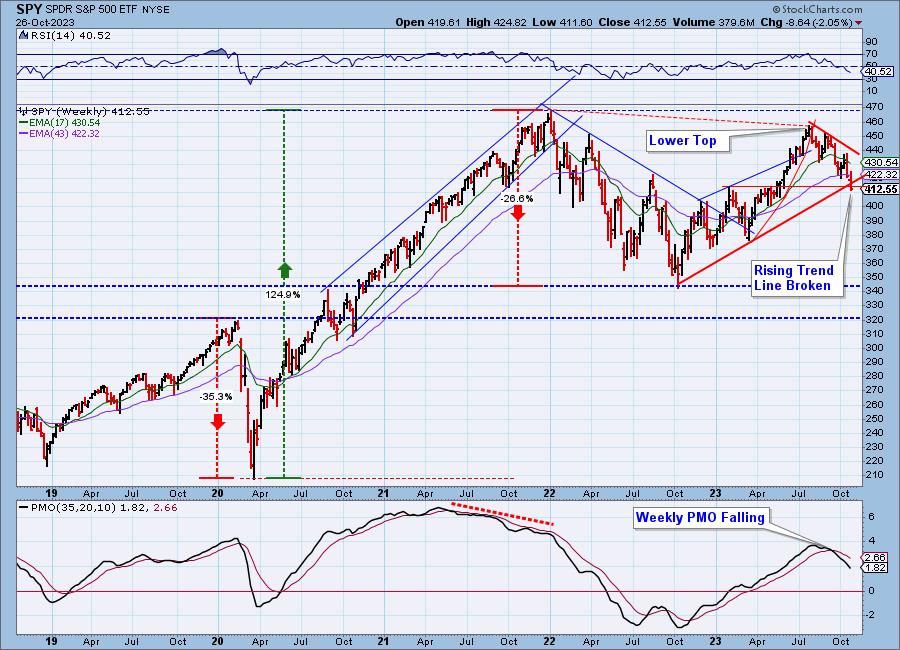 The S&P 500 (SPY) has fallen about 10 percent from the July top, and the last two weeks has been pretty rough, so should we be looking for the Bear to take charge again? First, looking at a weekly chart, it is not clear that the Bear actually left town. In spite of a great rally off the October 2022 low, the market top in July never actually exceed the January 2022 all-time high, so the current decline could be the next down leg of an ongoing bear market.
