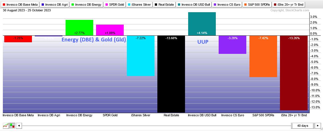 The Perfchart below shows the performance for 10 asset-based ETFs over the last forty days. Seven of the ten are down with Silver, REITs, the S&P 500 SPDR and the 20+ Yr Treasury Bond ETF leading the way lower. Three stand out. The DB Energy ETF (DBE), the Gold SPDR (GLD) and the Dollar Bullish ETF (UUP) are all higher.
