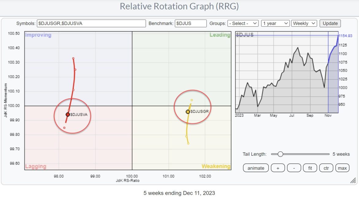 On the RRG above pay attention to the DJ Value Large and DJ Growth Large indices (pointing arrows). They are BOTH moving at a negative RRG-heading.