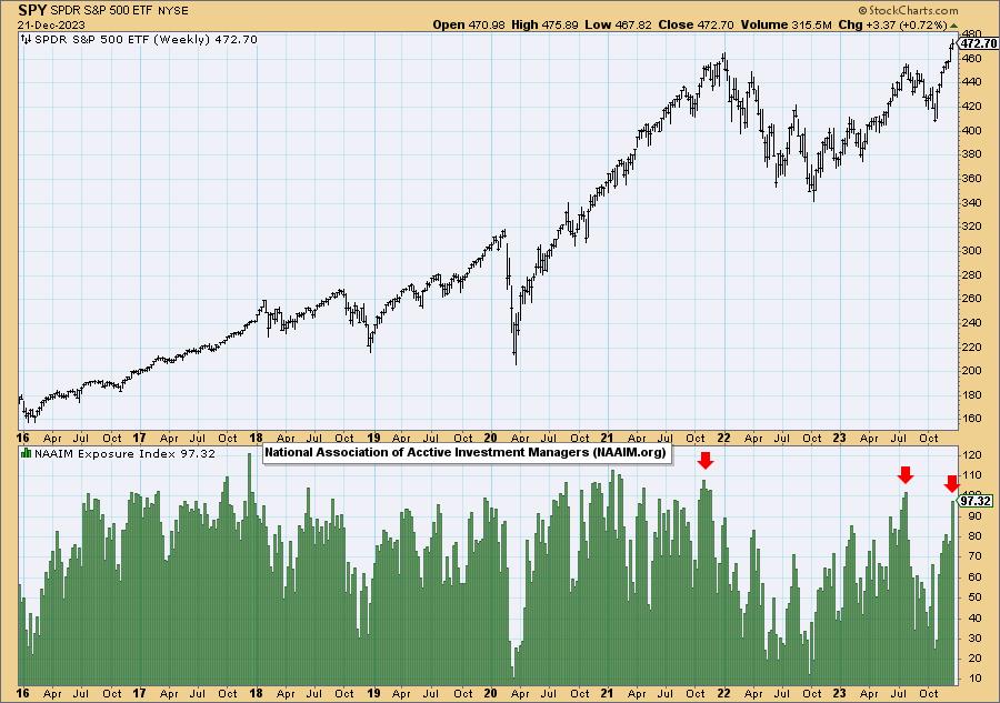 Next up is the American Association of Individual Investors (AAII) chart. Here we see some bullish extremes as noted not only by the amount of bulls, but also shown in the Bull/Bear Ratio. These high ratios often occur before declines. The 2020-2021 rally wasn’t bothered by these high ratios and that could be the case this time around as well, but this chart tells us to not let down our guard yet.