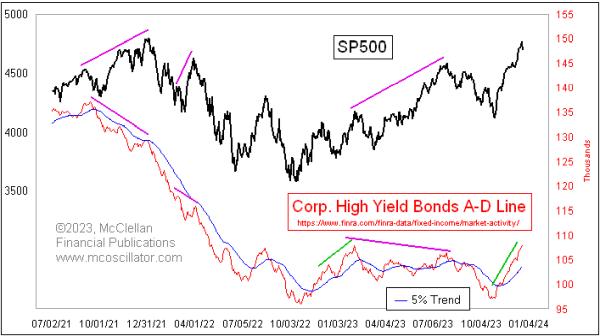 Back in 2021, I highlighted the big bearish divergence evident between the higher price highs in the S&P 500 and the lower tops in the High Yield Bond A-D Line. That was a correct omen of the liquidity troubles to come in 2022. Things started looking better coming out of the October 2022 bottom, when we saw strength in this HY Bond A-D Line, but that strength eventually gave way to another bearish divergence versus the S&P 500 in the summer of 2023.