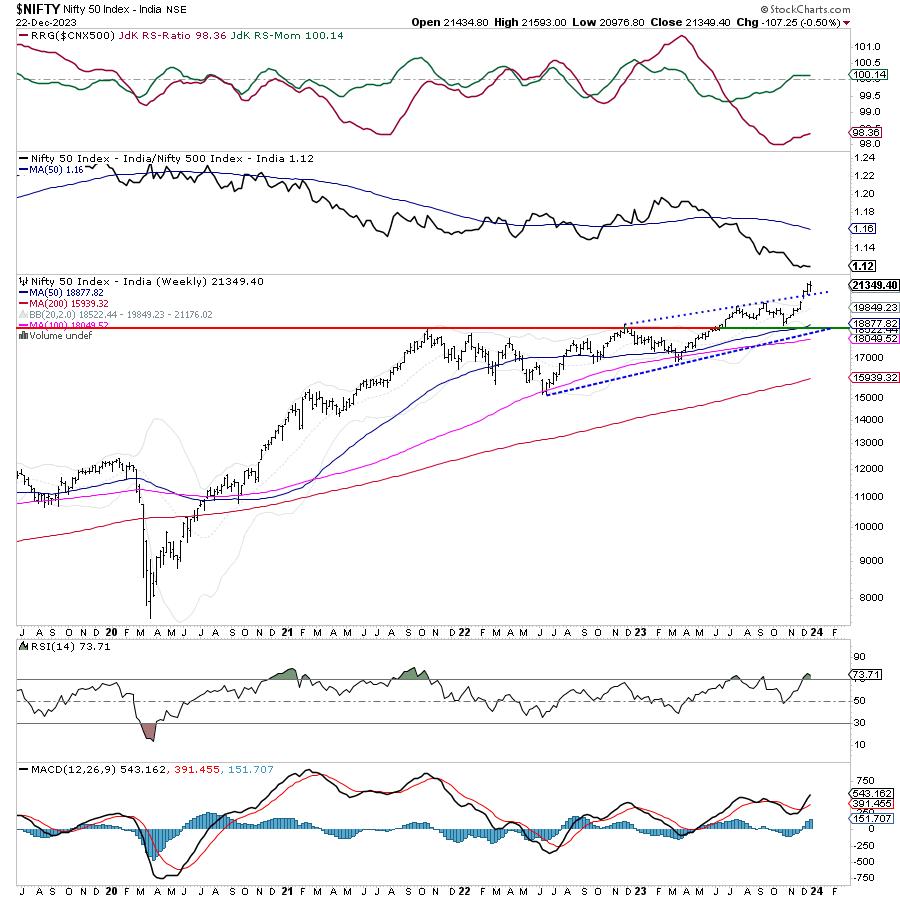 The coming week is a short week with Monday being a holiday on account of Christmas. The month has stayed strong so far with Nifty gaining 6.04%; the coming week will see the week, month, as well year coming to a close. While we did see some jitters on the daily charts, on a weekly basis we continue to remain overextended as the markets have run much ahead of their curve. The 20-week MA remains 1500 points below while the 50-week MA stays as far as 2472 points below the current levels. This kind of steep deviation from the mean and staying overextended on the charts continues to leave the markets to sharp and volatile profit-taking bouts from current as well as higher levels. Volatility spiked; India Vix rose 4.42% to 13.71 on a weekly note.