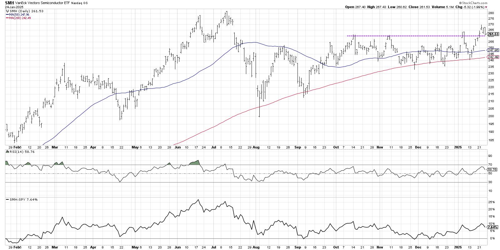 The failed breakout in the first week of 2025 was noteworthy in that it was punctuated by a bearish engulfing pattern, representing short-term distribution according to candlestick chart aficionados. On Tuesday of this week, we saw another breakout above the $260 level, and an upside follow-through day suggested that this breakout may finally have staying power.