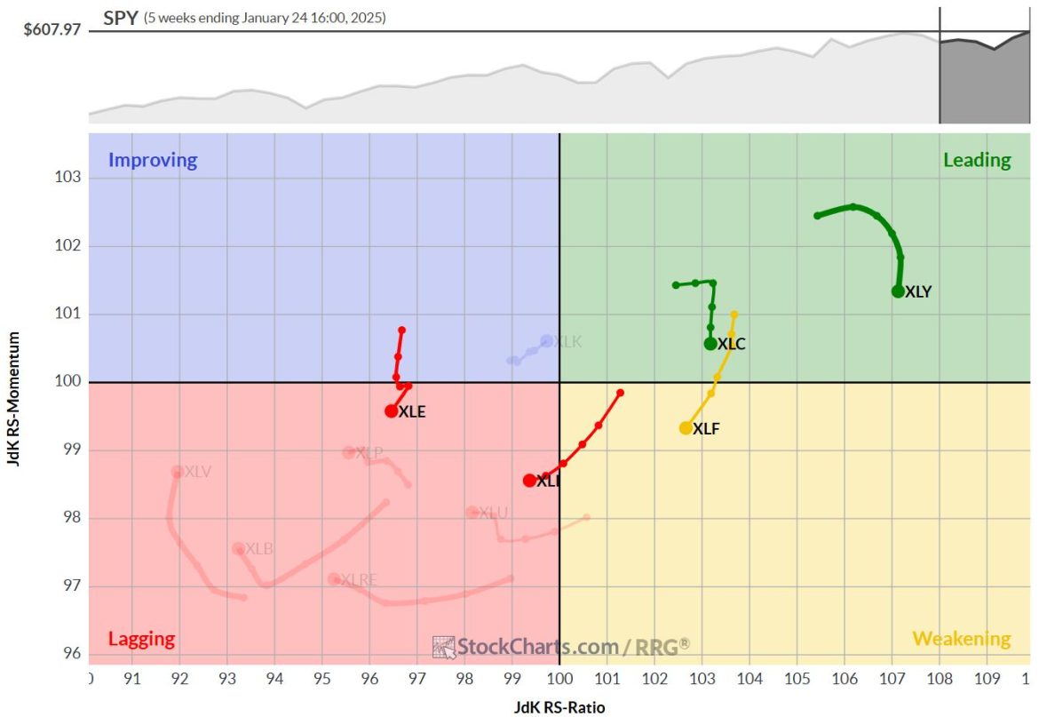 Based on the positions of XLE and XLK on the weekly RRG, it may seem strange that XLE is above XLK. However, looking at the daily RRG, it can be seen that XLE made a huge move into and through leading with a very high RS-ratio and RS-momentum reading, which dragged the sector above XLK.