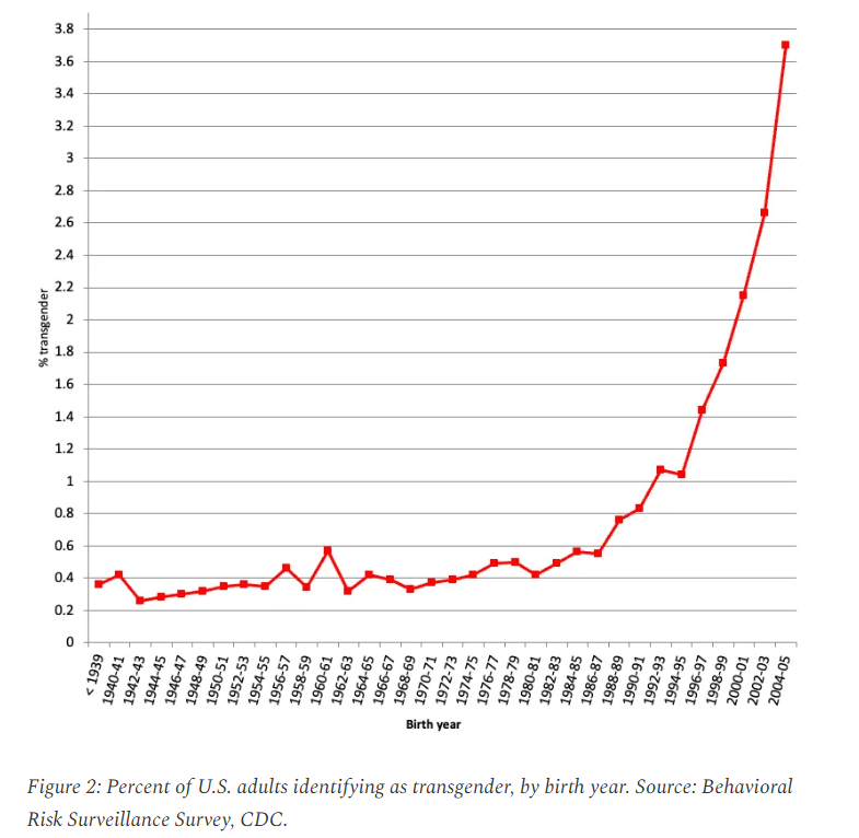 Some of this explosion might have to do with the fact that people who identify as transgender feel safer coming out of the closet than they might have in previous decades. But the size of the surge suggests that a lot of this is socially mediated; that is, young people are being pressured by peers or by authority figures (including by the promise of unconditional acceptance) into adopting an identity that isn’t really theirs.
