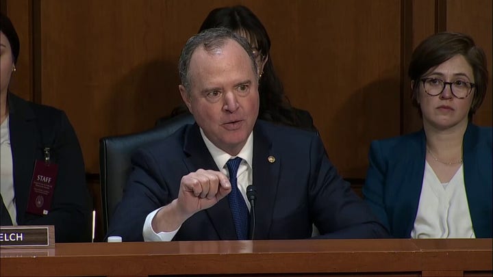 Sen. Adam Schiff, D-Calif., dug into granular language used by Patel after the Capitol riot in regard to a song released by inmates that featured Trump reciting the Pledge of Allegiance.