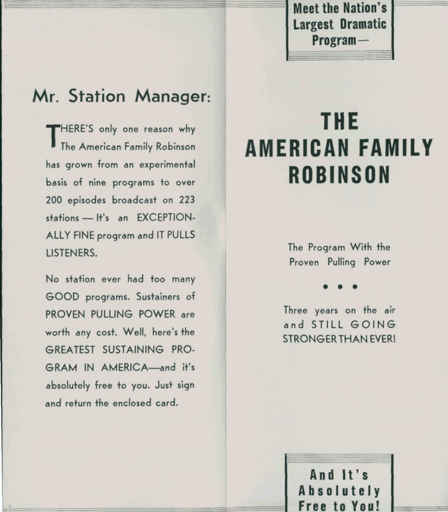 The American Family Robinson was one program that suffered pressures from both the FCC and the “voluntary code” of the National Association of Broadcasters. The code prohibited stations from accepting “free offers” if the purpose was to recruit members for an organization or to foster a point of view.