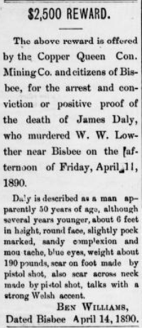 The Tombstone Epitaph, for instance, reported 31 separate reward offers involving Cochise County, Arizona, between August 1887 and 1893—a county that reported fewer than 7,000 residents in the 1890 census. Roughly half of these were offered by private parties. One such ad from the March 15, 1891, edition of the Tombstone Epitaph reported the following: