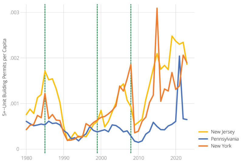 The results here are similar to those in Figure 1, except that Pennsylvania and New York switch places. Pennsylvania produces more housing than New York, but New York produces more multifamily housing than Pennsylvania, which is not surprising since New York is more urbanized. After 1990, New Jersey’s permitting of larger multifamily buildings closely tracks New York’s, but New Jersey did have a slightly higher rate between 2016 and 2022.