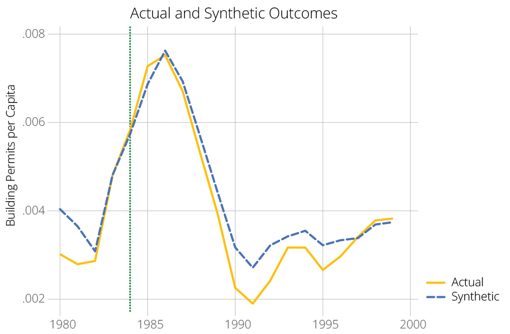 Figure 5 shows the results of the synthetic control analyses of total building permits per capita for the two treatment periods.