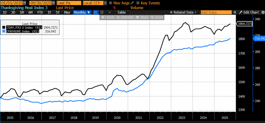 The shutdown-induced absence of October CPI data injects unusual uncertainty into this year’s analysis. Without the month that typically anchors holiday food-price assessments, economists have turned to private-sector trackers to gauge October and early November conditions. Most show continued moderation in broad food-at-home categories, along with a mix of small declines and increases across Thanksgiving components — consistent with the slight but widespread upward drift seen in the official September data. When BLS backfills or combines the missing data later this year, the trendlines will become clearer, but for now the picture is incomplete.