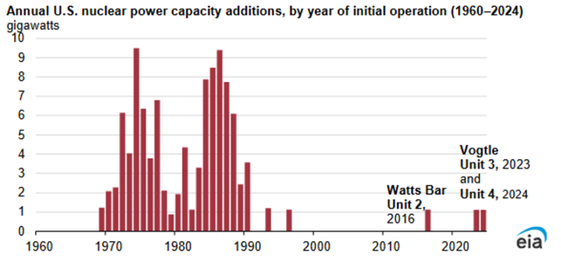 7. New subsidies in the Energy Policy Act of 2005 resulted in four new reactors. Two were abandoned during construction, and two entered service after multiple delays and major cost overruns (2023, 2024).