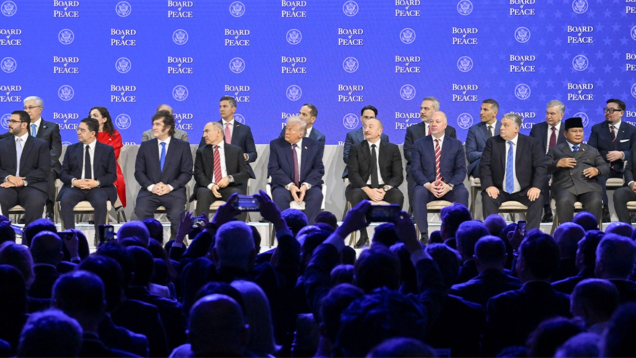 White House press secretary Karoline Leavitt called forward the following leaders to sign the founding charter alongside President Donald Trump, who was seated in the center.