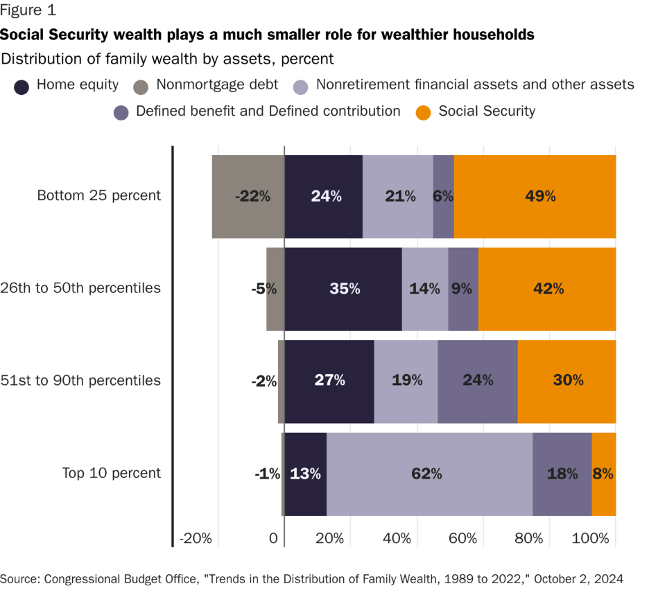 A report by the Congressional Budget Office, titled “Trends in the Distribution of Family Wealth, 1989 to 2022,” elucidates the role that Social Security plays in total household wealth. By counting not just financial assets and home equity, but also the present value of future Social Security benefits, it becomes clear that Social Security represents a substantial share of total resources for lower-wealth families and only a marginal share for wealthy households.