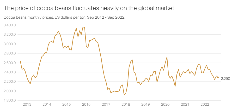 The International Cocoa Organization notes that roughly 70 percent of cocoa is produced in Africa, with Côte d’Ivoire and Ghana leading output at about 1,850 and 650 thousand tons, respectively, in 2025. Cocoa is central to both economies, accounting for about 15 percent of Côte d’Ivoire’s GDP and seven percent of Ghana’s GDP. In 2018, the two nations formed the Côte d’Ivoire–Ghana Cocoa Initiative (CIGCI), informally referred to as “COPEC.” Its stated aim is to correct perceived market failures by raising prices: “Without correcting the many market failures, the cocoa economy is destined to become a counter-model of sustainability.”