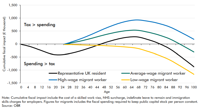 In September 2024, Britain’s Office of Budget Responsibility investigated “the cumulative fiscal impact” of immigrants of different skill levels. It found, as Figure 1 shows, that the “Representative UK resident” is a cumulative net drain on the exchequer up to their mid-40s, after which they become a net contributor until they turn 80, when they become a net drain again.